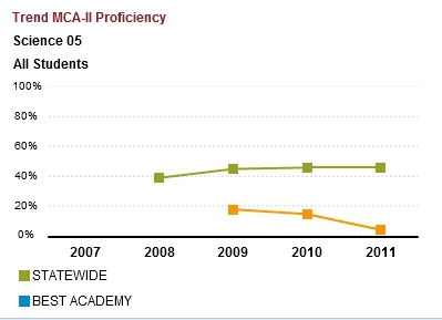 An average of all Minnesota students for all grades is a science proficiency rate of approximately 45%. Harvest Prep has a proficiency approaching zero. Next are the science scores for the Best Academy: