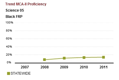 Here the story is much the same. Science scores for Best Academy fifth graders are bad and trending worse. In fairness, Best has improved science scores for its eighth grade students, who have improved to about a 30 percent proficiency rate. Best and Harvest science scores for fifth graders are actually much worse than statewide scores for students who are both black and receive free or reduced lunch, where scores are approaching 20 percent proficiency: