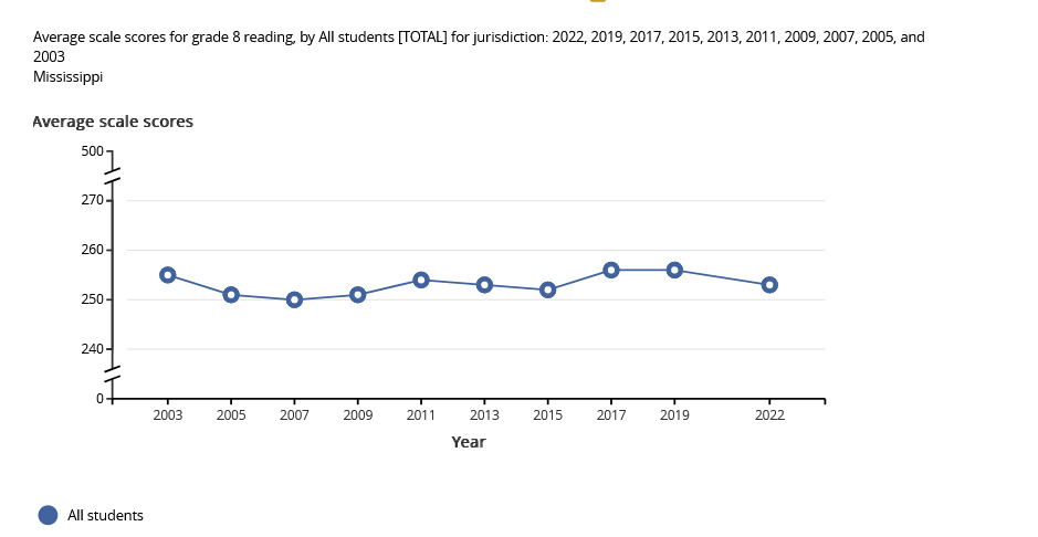Occam's razor would suggest that if you take your lowest scoring third graders and run them through third grade again fourth grade scores will be higher across the board. And that's what happened. Did SoR help? Probably not, because after more than a decade of SoR EIGHTH grade reading scores in Mississippi haven't budged.