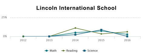 At Lincoln International School in Minneapolis test score proficiency hovered near zero for all three tested subject areas of the past four years. Lincoln's 144 students are 77% Black / African American and 21% Hispanic, and was started with a $250,000 grant from the Walton Family Foundation in 2008.