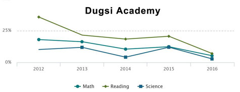 St. Paul's Dugsi Academy, a charter school that opened in 2005, has math, reading and science scores approaching zero for 2016. Dugsi enrolled 392 students in 2016, 99% of them Black /African American.