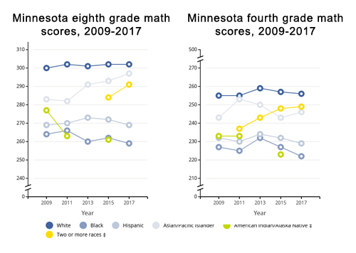 In terms of addressing the so-called 'achievement gap' in the state among White, Black and Hispanic students not much changed in the era. For Black students in particular the test score proficiency gaps either stayed the same or got worse. For eighth grade math scores, according to the National Assessment of Educational Progress — the 'Nation's Report Card' — the spread between Whites and Blacks increased 20% from 2009 to 2017. The same is true for fourth grade math, where the gap increased 21%.